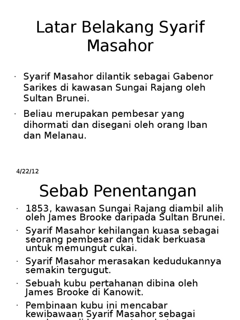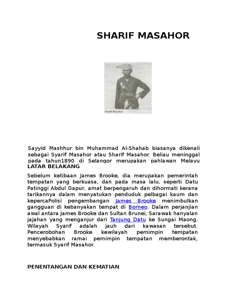 Web Syarif_Masahor Syarif Masahor bin Muhammad Al-Shahab biasanya dikenali sebagai Syarif Masahor atau Sharif Masahor 1 beliau meninggal pada tahun 1890 di Selangor. Web TUSUT ATAU SALASILAH RAJA BERANI 22RENTAP PEMIMPIN MASYARAKAT IBAN MENENTANG DI SARAWAK. Web Syarif Masahor Birth unknown Death 1890 Burial.